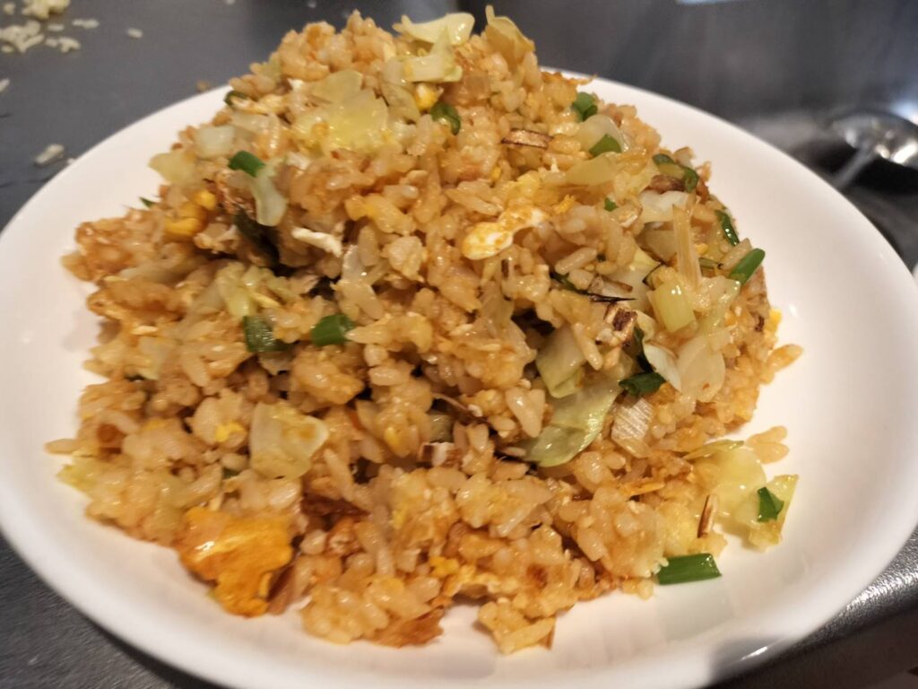 最近うすうす気づいていましたが、具材はできるだけご飯に合うように小さくした方がよさそうです。なのでそれを意識し、キャベツとネギは小さく切りました。